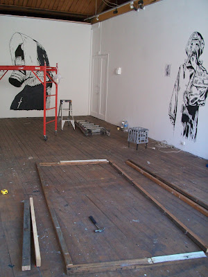 So I started the install for the exhibition on Sunday afternoon and carried on all day Monday. I managed to get 4 wall drawings done in an afternoon and a morning. With the help of David and Tristan at the gallery, we managed to build the shell of the hut/church. We still need to fix a window into the front, fill in the gaps and wood stain the whole thing.